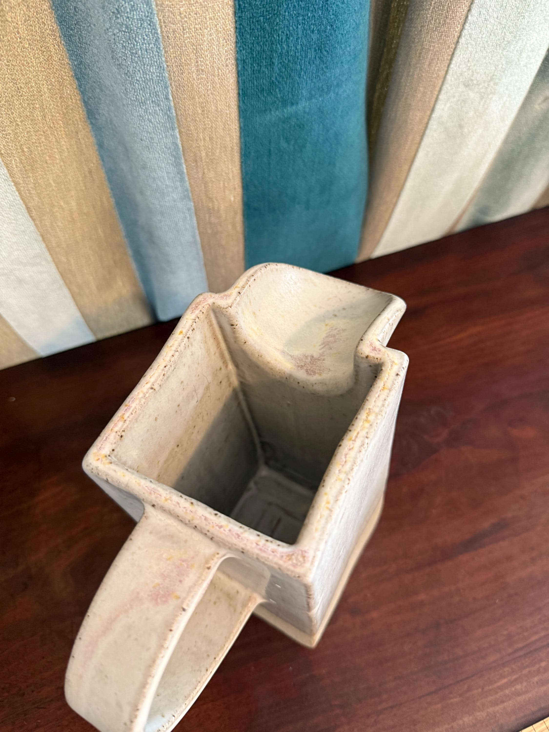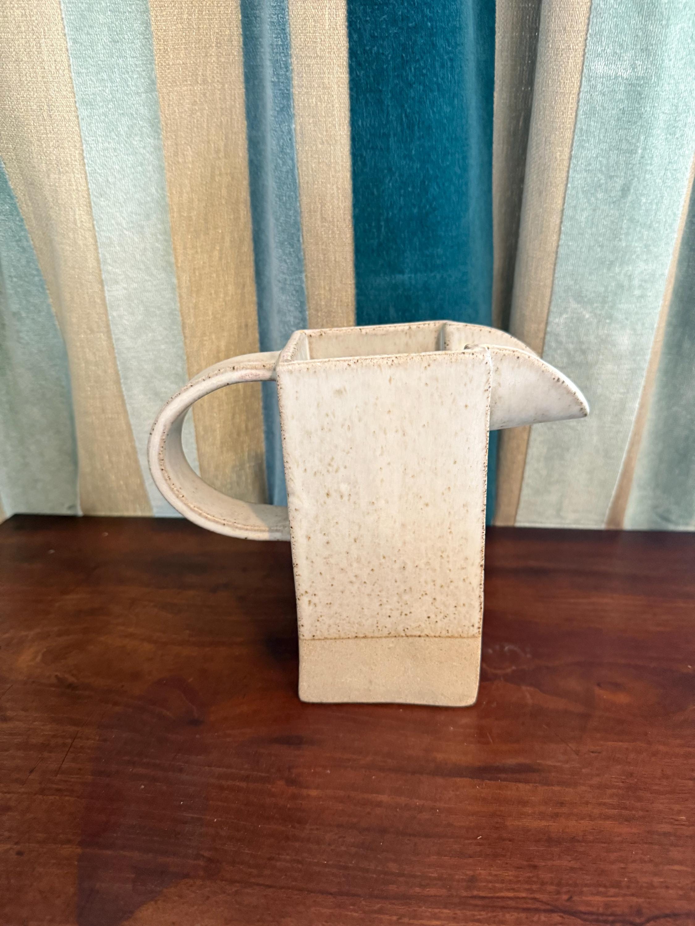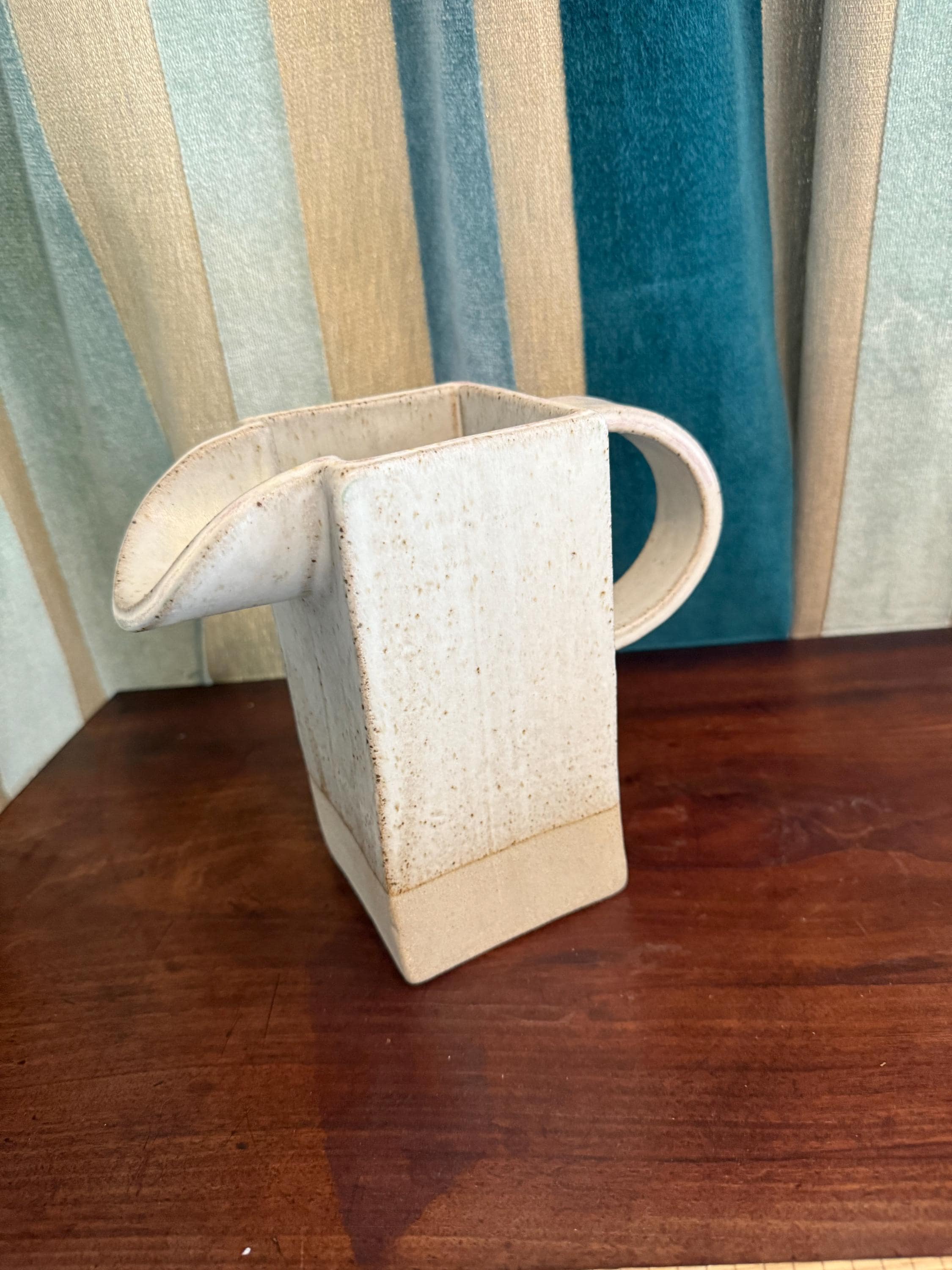 Discover the charm of contemporary British studio pottery with this exquisite hand-thrown stoneware jug by Tom Butcher, signed with his initials "TB." This unique piece features a striking squared body, an angular spout, and a beautifully crafted loop handle, making it a standout addition to any collection. The jug is finished with a natural oatmeal speckled glaze, highlighting the clean and functional design that Tom Butcher is celebrated for. Standing approximately 18 cm tall, it serves as both a rustic pitcher for everyday use and a fine collectible for modern ceramics enthusiasts. Embrace the elegance and artistry of this jug, perfect for enhancing your home decor or as a thoughtful gift for lovers of handcrafted pottery.