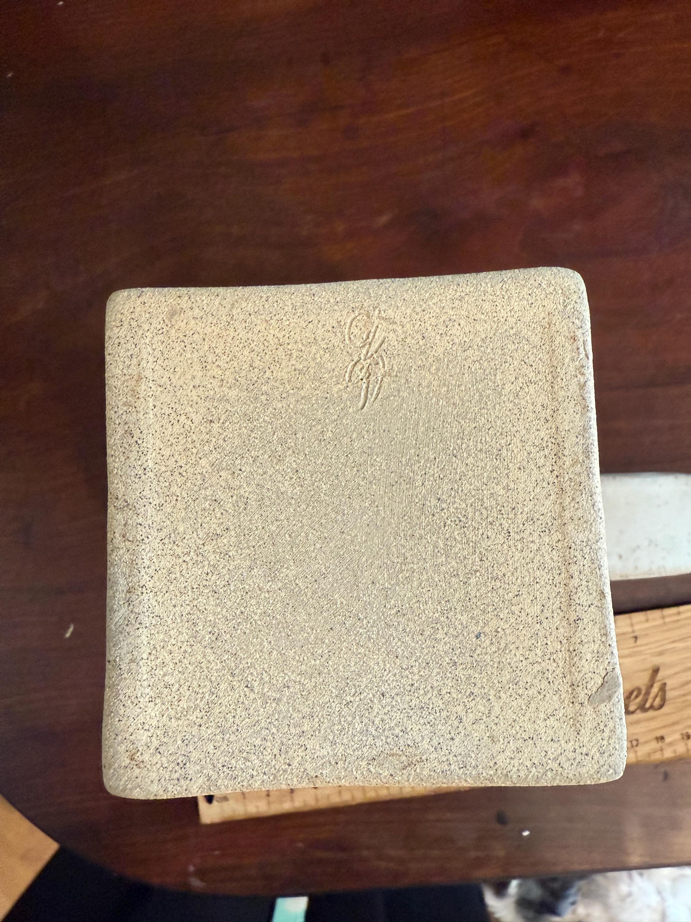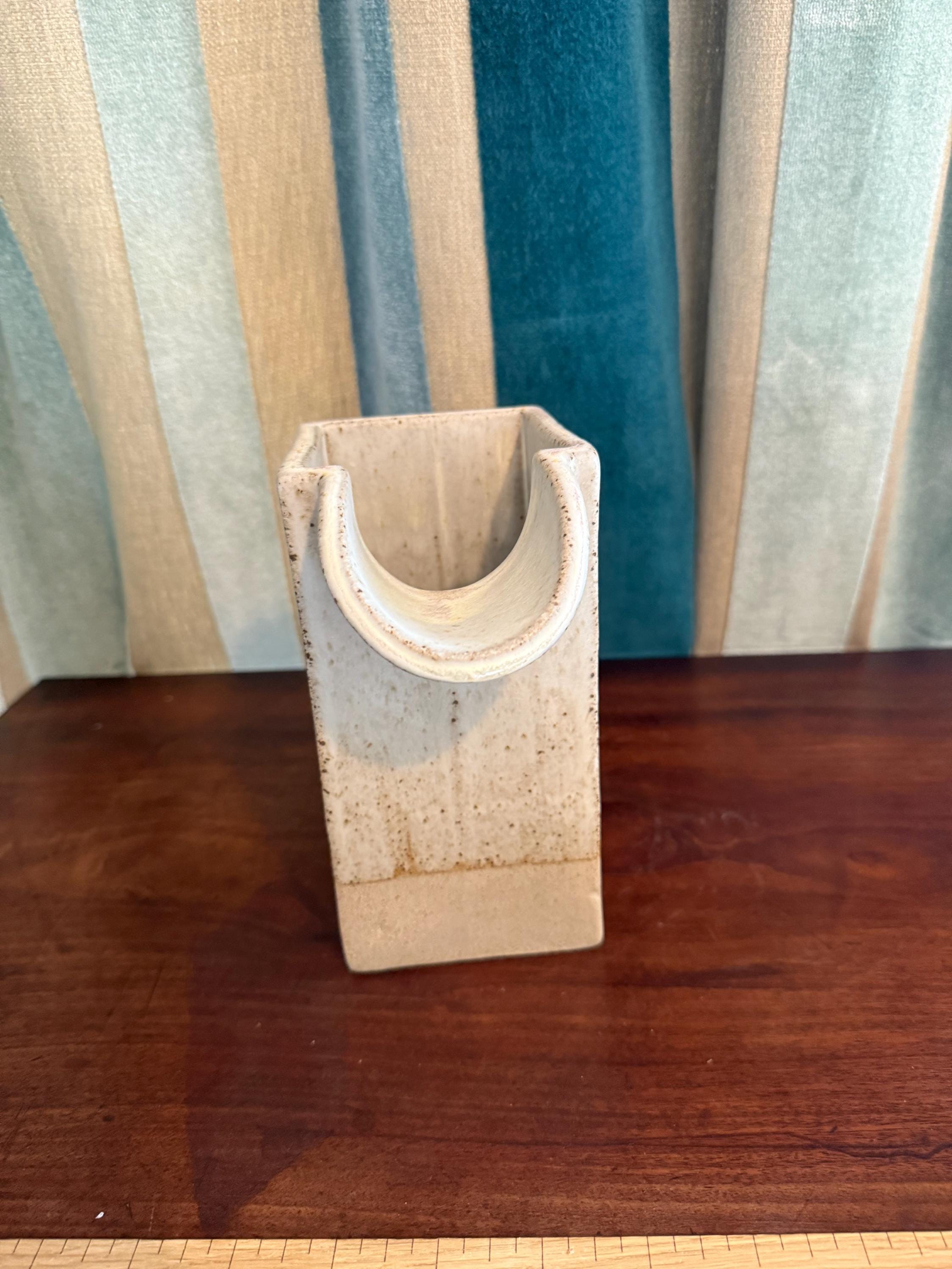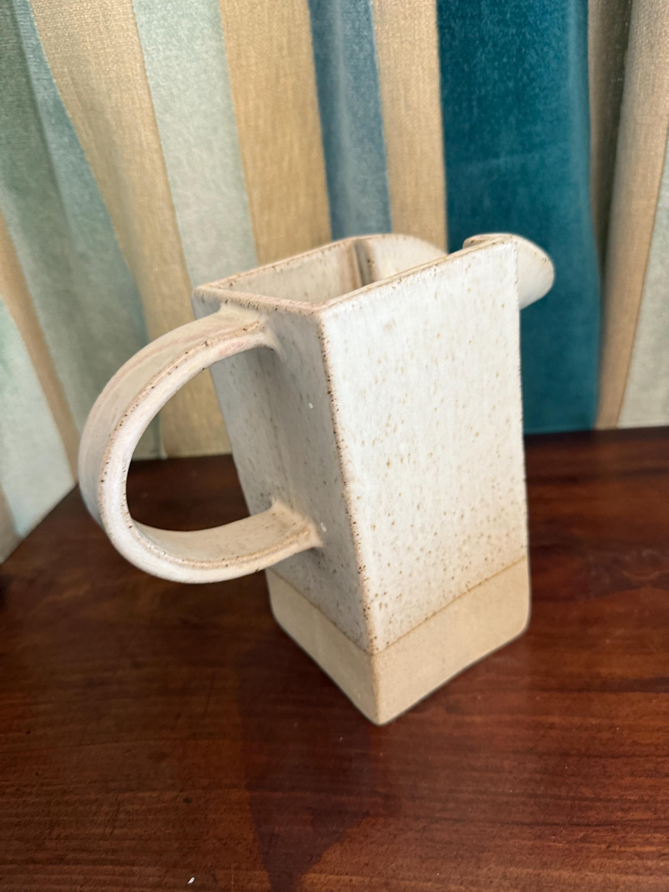 Discover the charm of contemporary British studio pottery with this exquisite hand-thrown stoneware jug by Tom Butcher, signed with his initials "TB." This unique piece features a striking squared body, an angular spout, and a beautifully crafted loop handle, making it a standout addition to any collection. The jug is finished with a natural oatmeal speckled glaze, highlighting the clean and functional design that Tom Butcher is celebrated for. Standing approximately 18 cm tall, it serves as both a rustic pitcher for everyday use and a fine collectible for modern ceramics enthusiasts. Embrace the elegance and artistry of this jug, perfect for enhancing your home decor or as a thoughtful gift for lovers of handcrafted pottery.