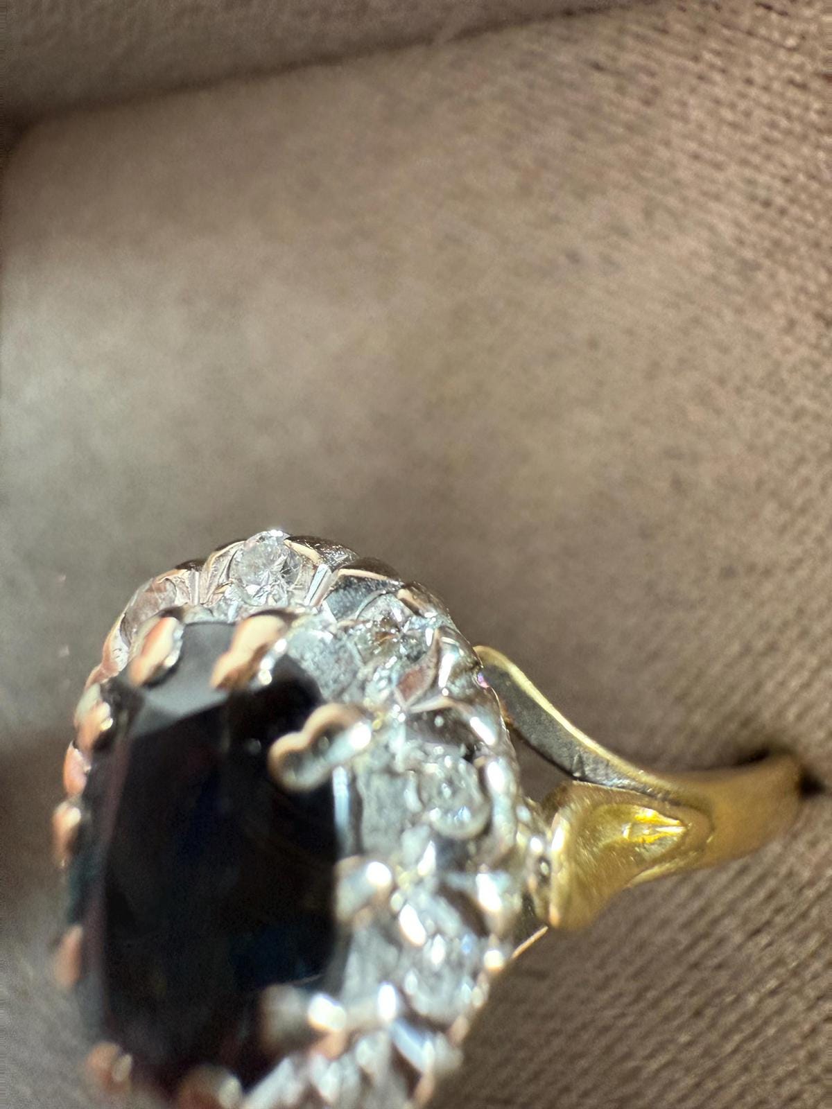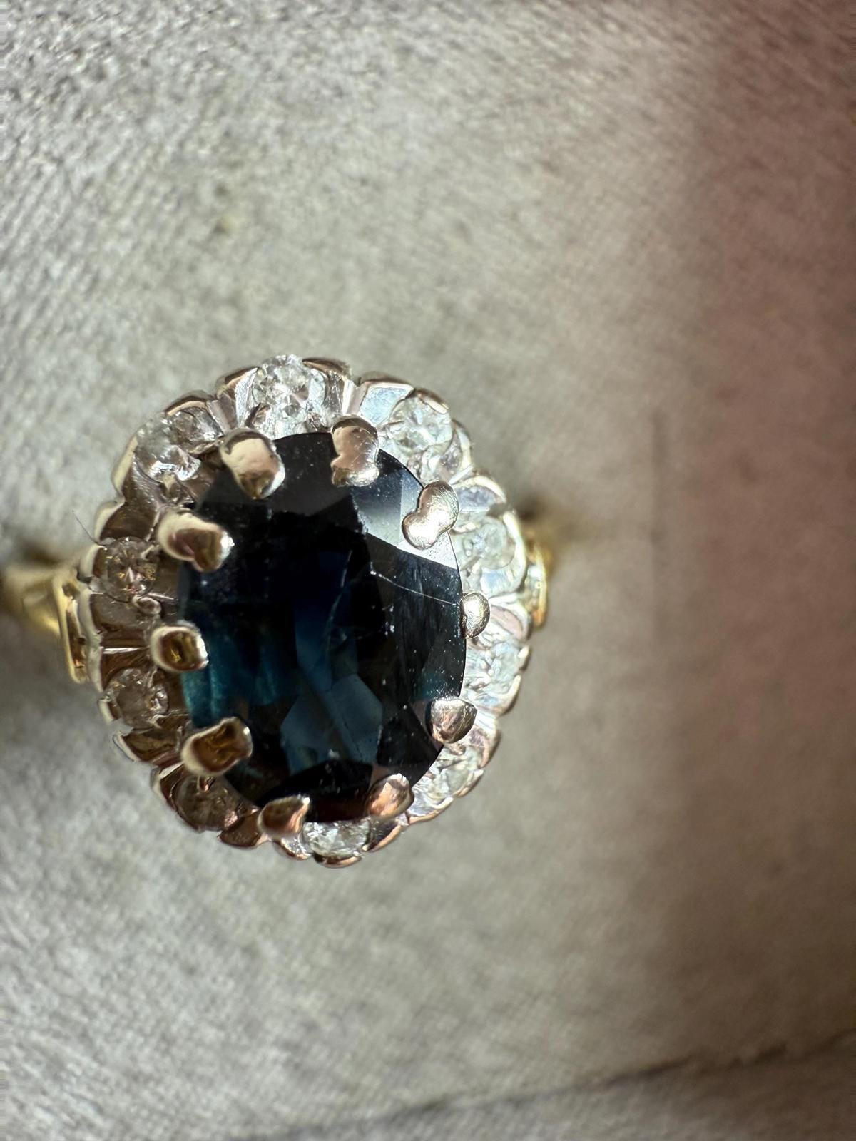 vintage sapphire ring, 1ct sapphire diamond, 1973 hallmarked ring, London vintage jewellery, 18ct gold cluster, oval sapphire halo, white gold sapphire ring, princess Diana style ring, September birthstone jewellery, vintage engagement ring, antique sapphire